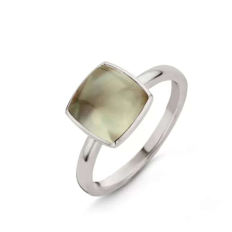 Pantelleria ring in 18K white gold with prasiolite on MOP.