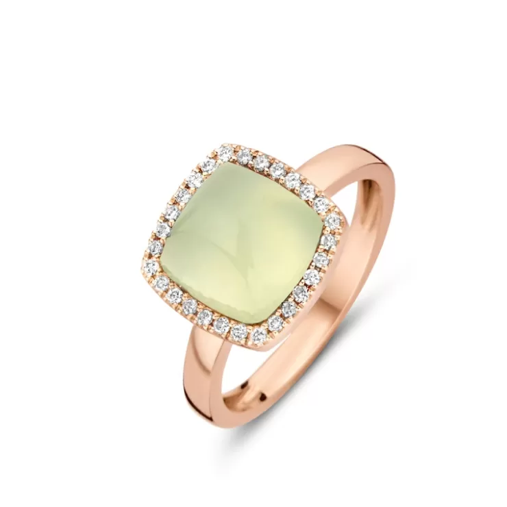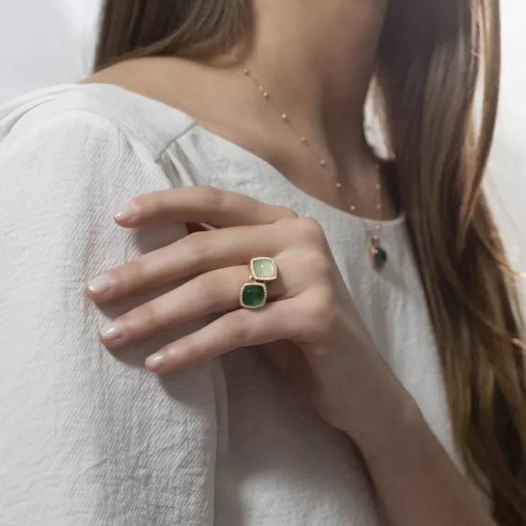Pantelleria ring in 18 kt rose gold set with prehnite on MOP and diamonds.