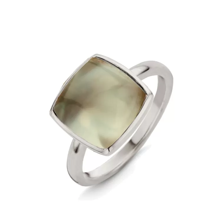 Pantelleria ring in 18K white gold with prasiolite on MOP.