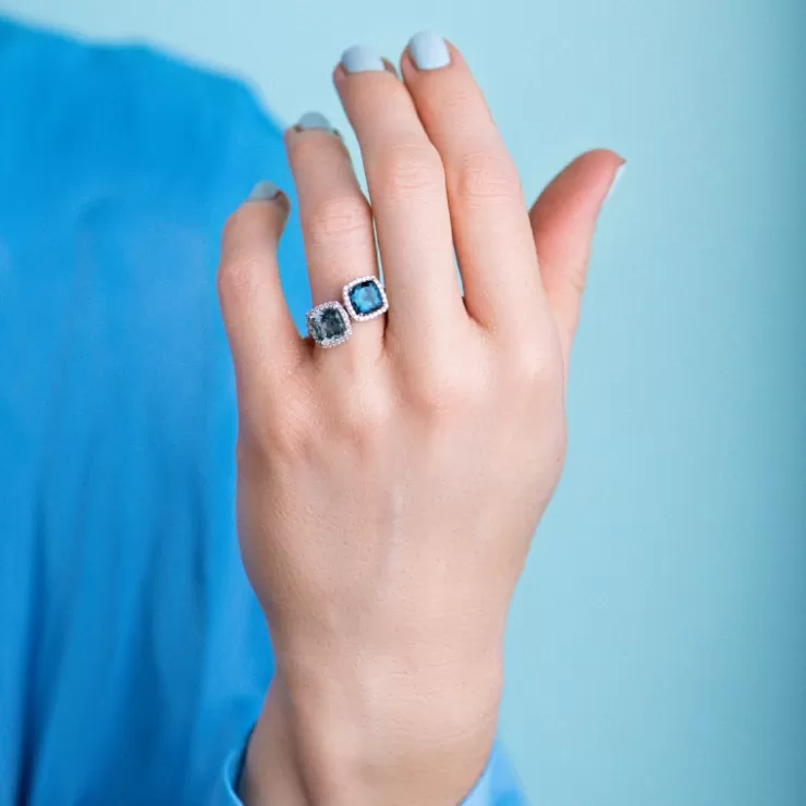 Etna ring in 18K white gold with Swiss Blue topaz and diamonds.