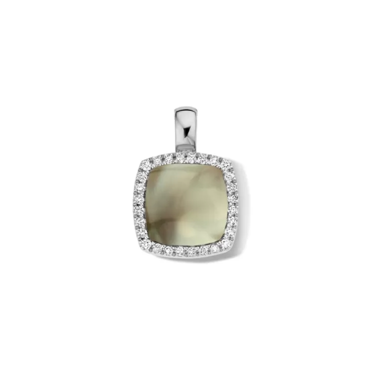 Pantelleria pendant in 18 kt white gold set, prasiolite on MOP and diamonds.