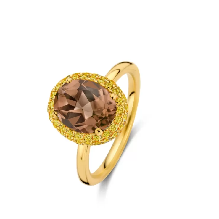 Etna ring in 18K yellow gold with smokey quartz and yellow sapphire.