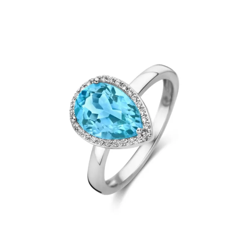 Etna ring in 18K white gold with Swiss Blue topaz and diamonds.