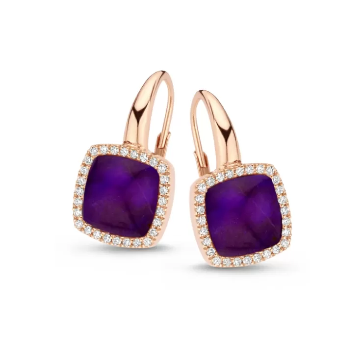 Pantelleria earrings in 18 kt rose gold with quartz+sugilite on MOP and diamonds.