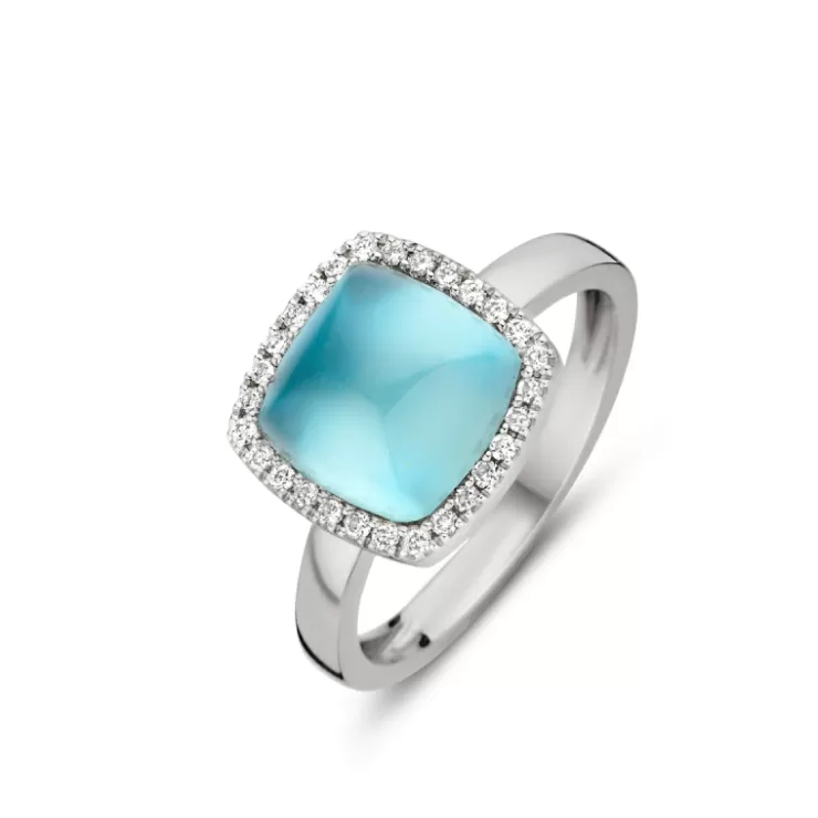 Pantelleria ring in 18 K white gold, Swiss Blue topaz on MOP and diamonds.
