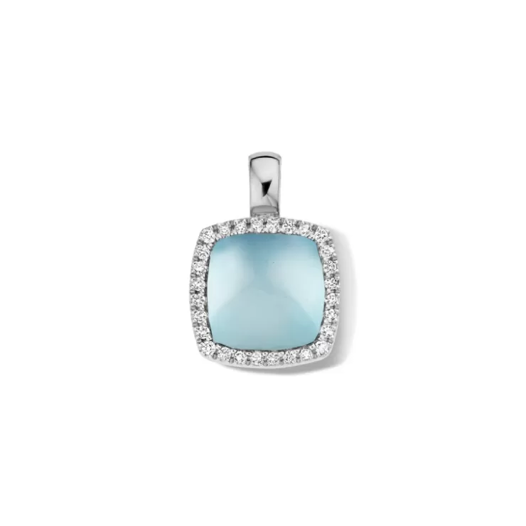 Pantelleria pendant in 18K white gold, Sky Blue topaz on MOP and diamonds.