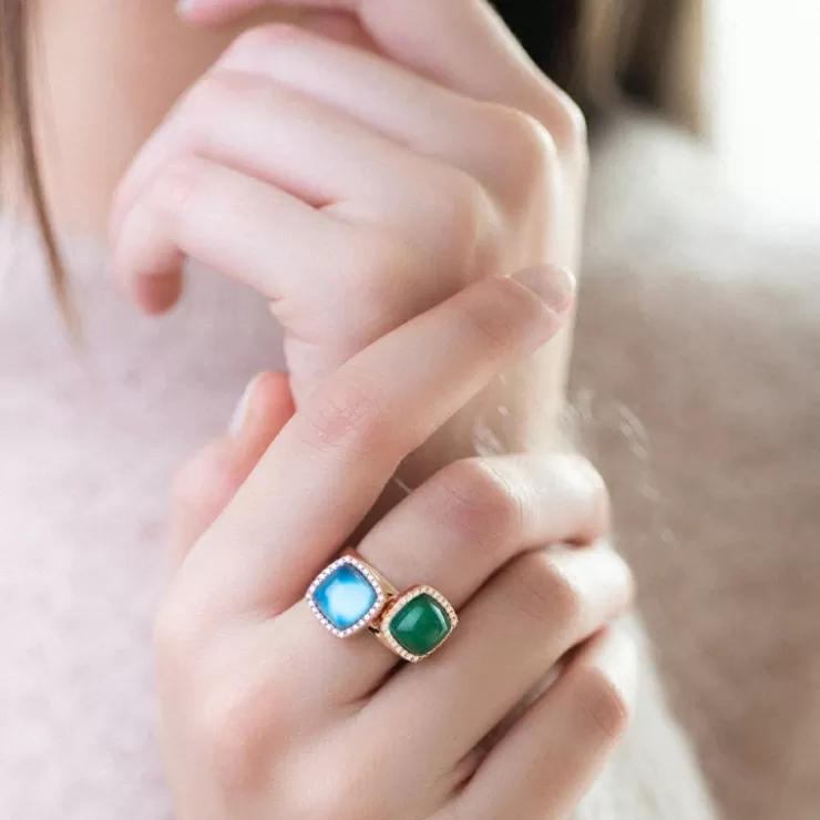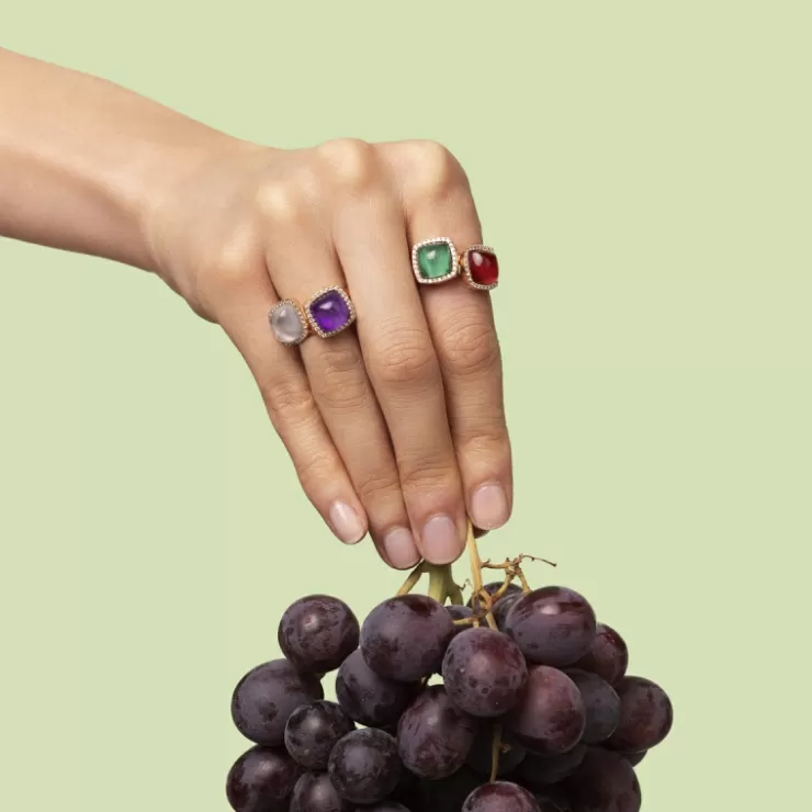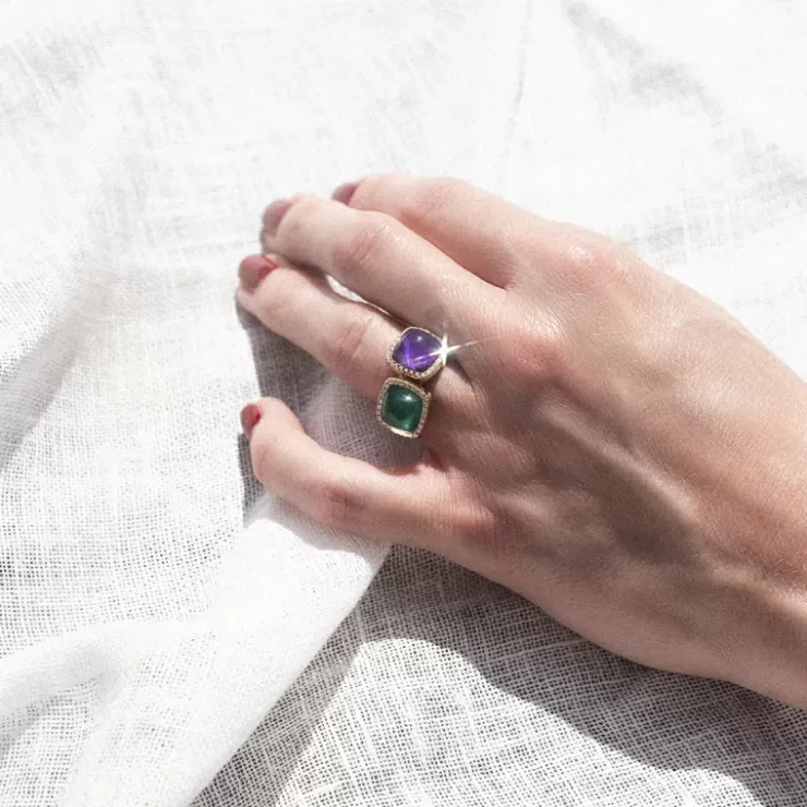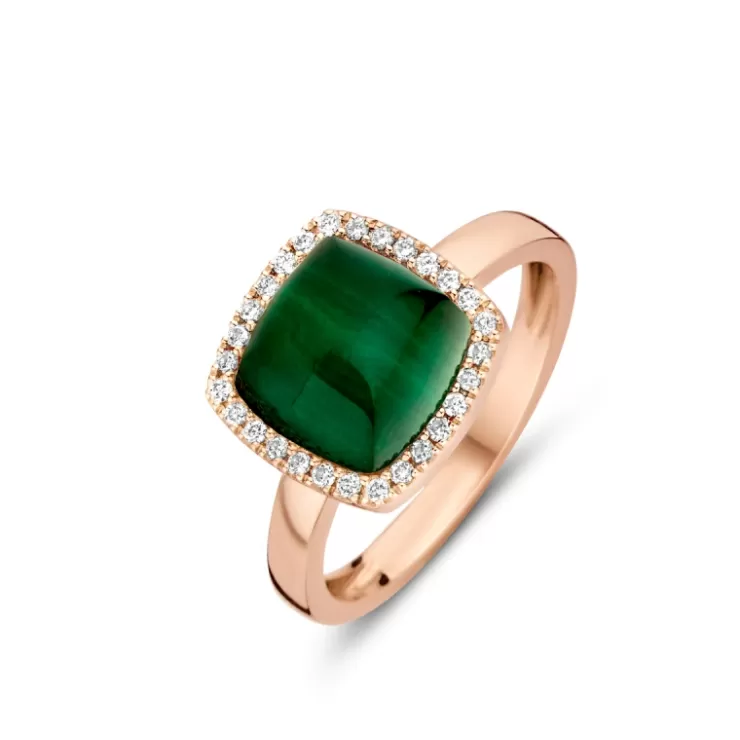 Pantelleria ring in 18 kt rose gold with rock crystal on malachite and diamonds.
