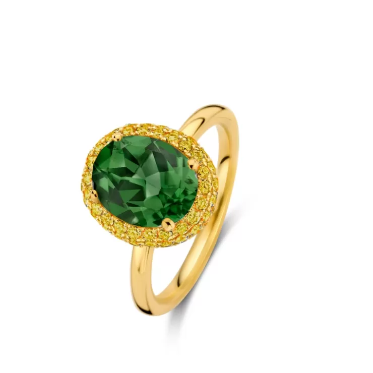 Etna ring in 18K yellow gold with green tourmaline and yellow sapphire.