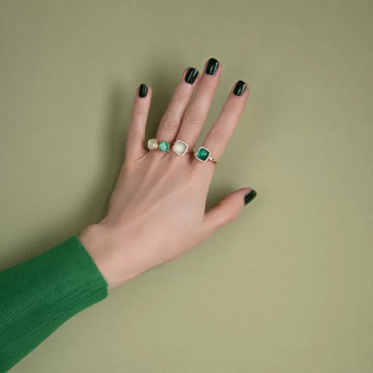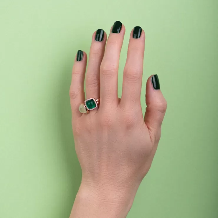 Pantelleria ring in 18 kt rose gold set with prehnite on MOP and diamonds.
